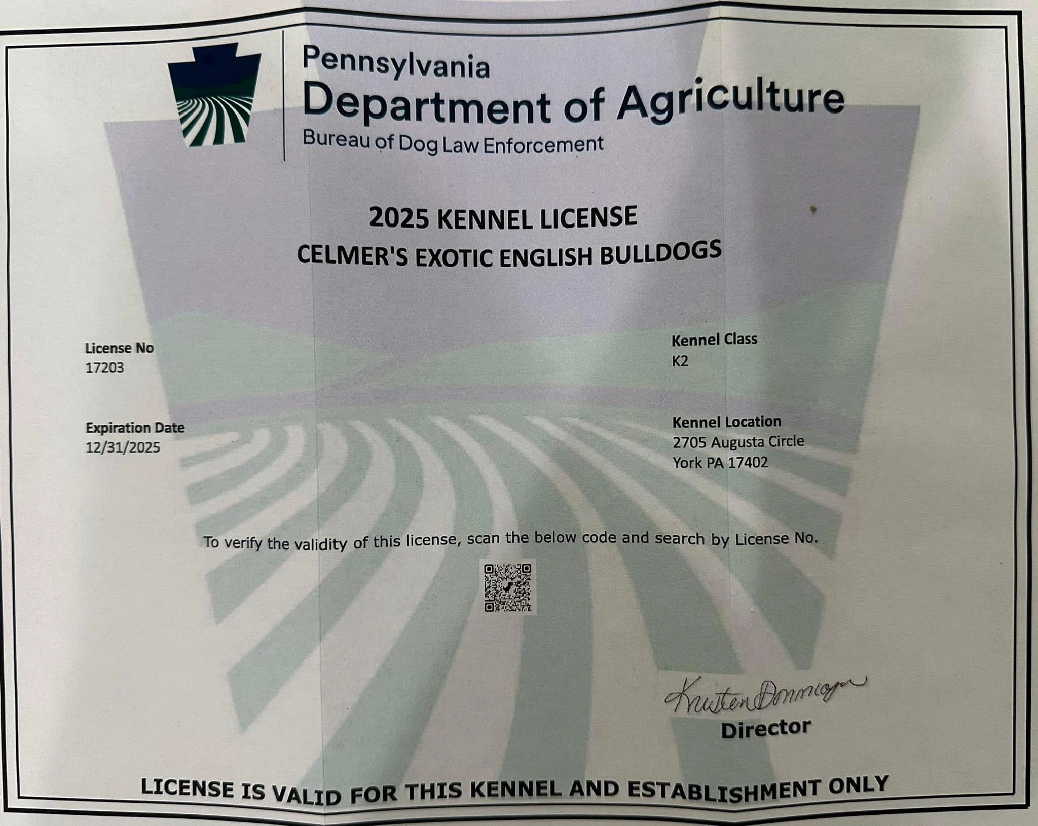 My name is Lori Ann Celmer. I have been a bulldog enthusiast for many years and have been breeding since 2016. My husband and my daughter are actively involved in caring for and loving all our fur babies. Our dogs are our family. All our dogs are AKC registered and they are raised in a healthy, loving environment. As a breeder I focus on health, structure, temperament, socialization and pedigree in order to achieve my goal of providing to you a top quality baby that will not only capture your heart but will be a perfect fit for you and your family. I am also state licensed. For more information please contact Lori or Alan Celmer at (717)821-1395 or (717)821-1389. York, Pa 17402